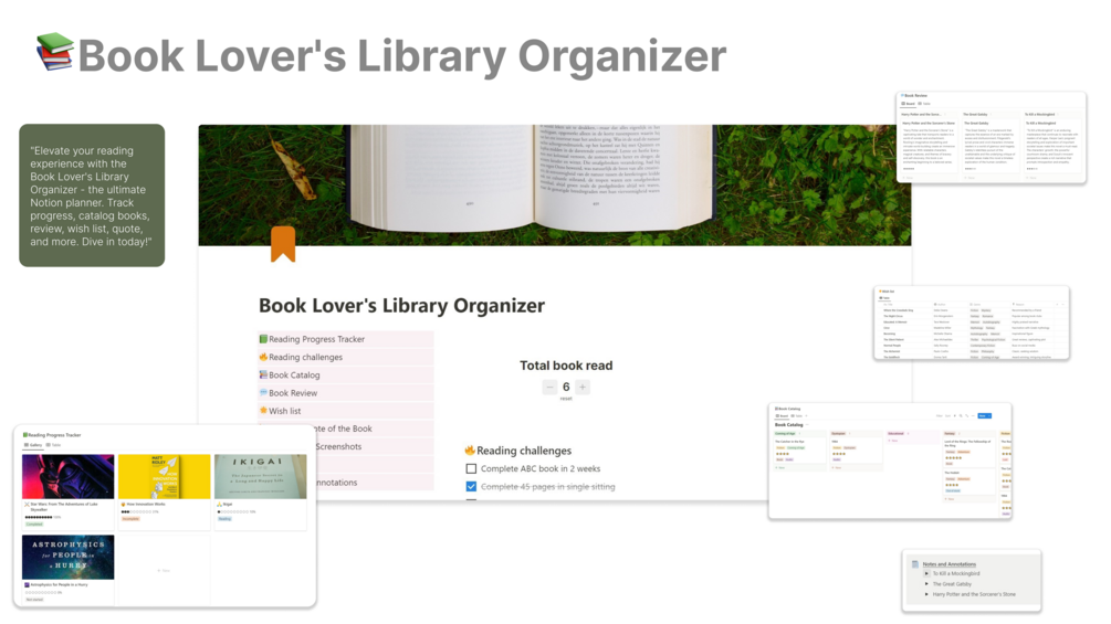 "Introducing the Book Lover's Library Organizer, your ultimate companion for a literary journey like no other. This Notion planner offers a comprehensive suite of features to enhance your reading experience: